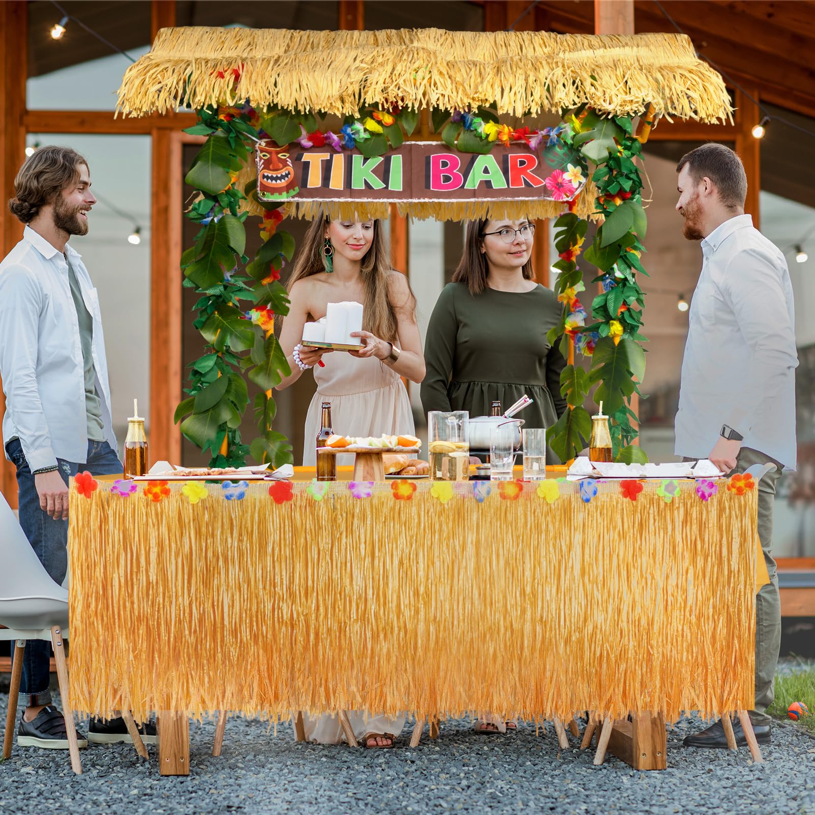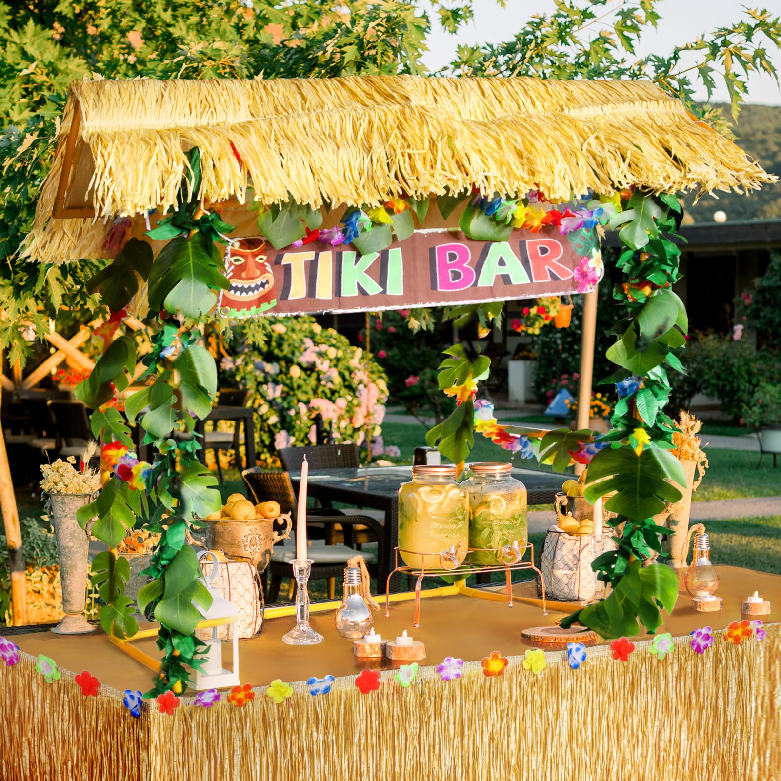 - Package Included: Come with 1 pack tiki bar hut,1 pc tiki bar roof, 1 pc tiki bar banner, 1 pc luau party flower garland, 1 pc Hawaiian luau grass table skirt, 1 pc tablecloth, 30 pcs artificial palm leaves, 8 pcs adhesive stickers, 2 strips artificial green leaves, 4 sheets glue points and an instruction. A full set to meet your needs of hold various parties
