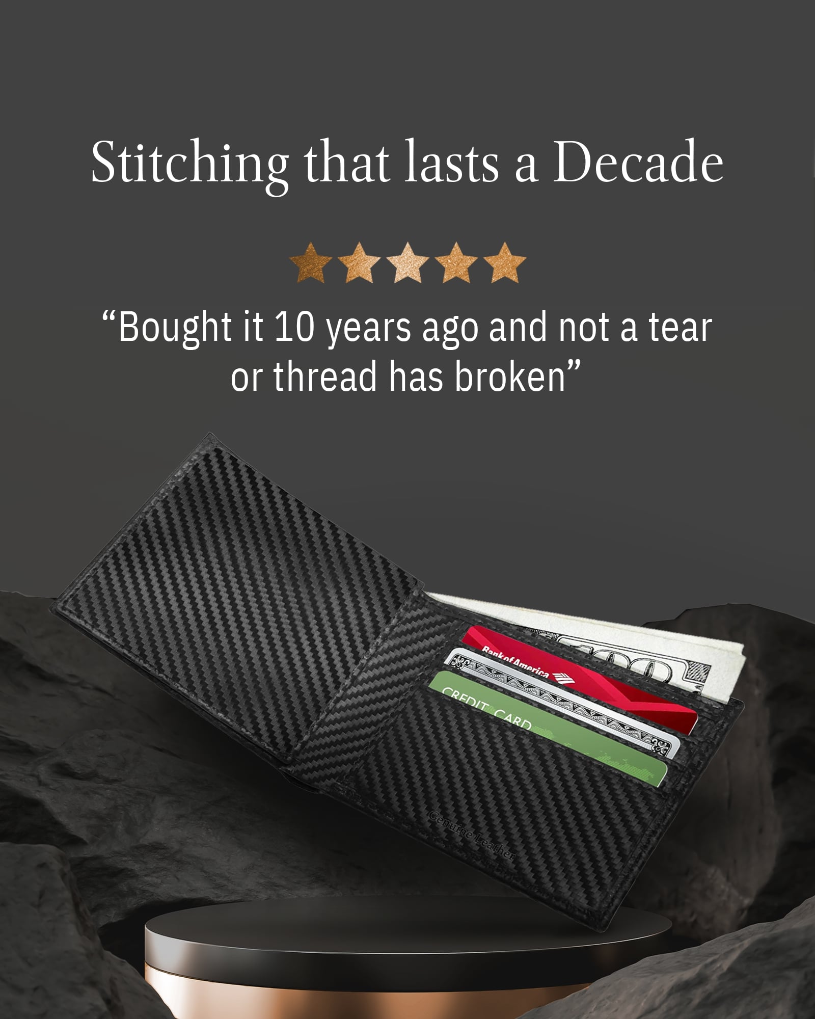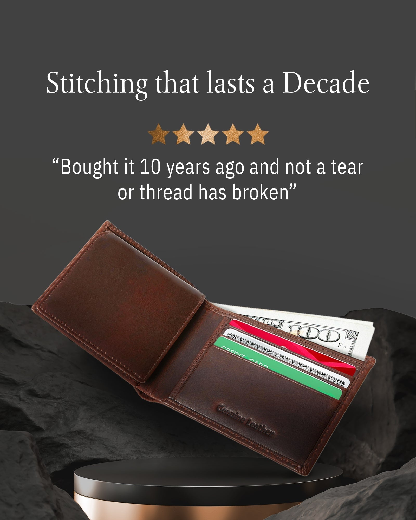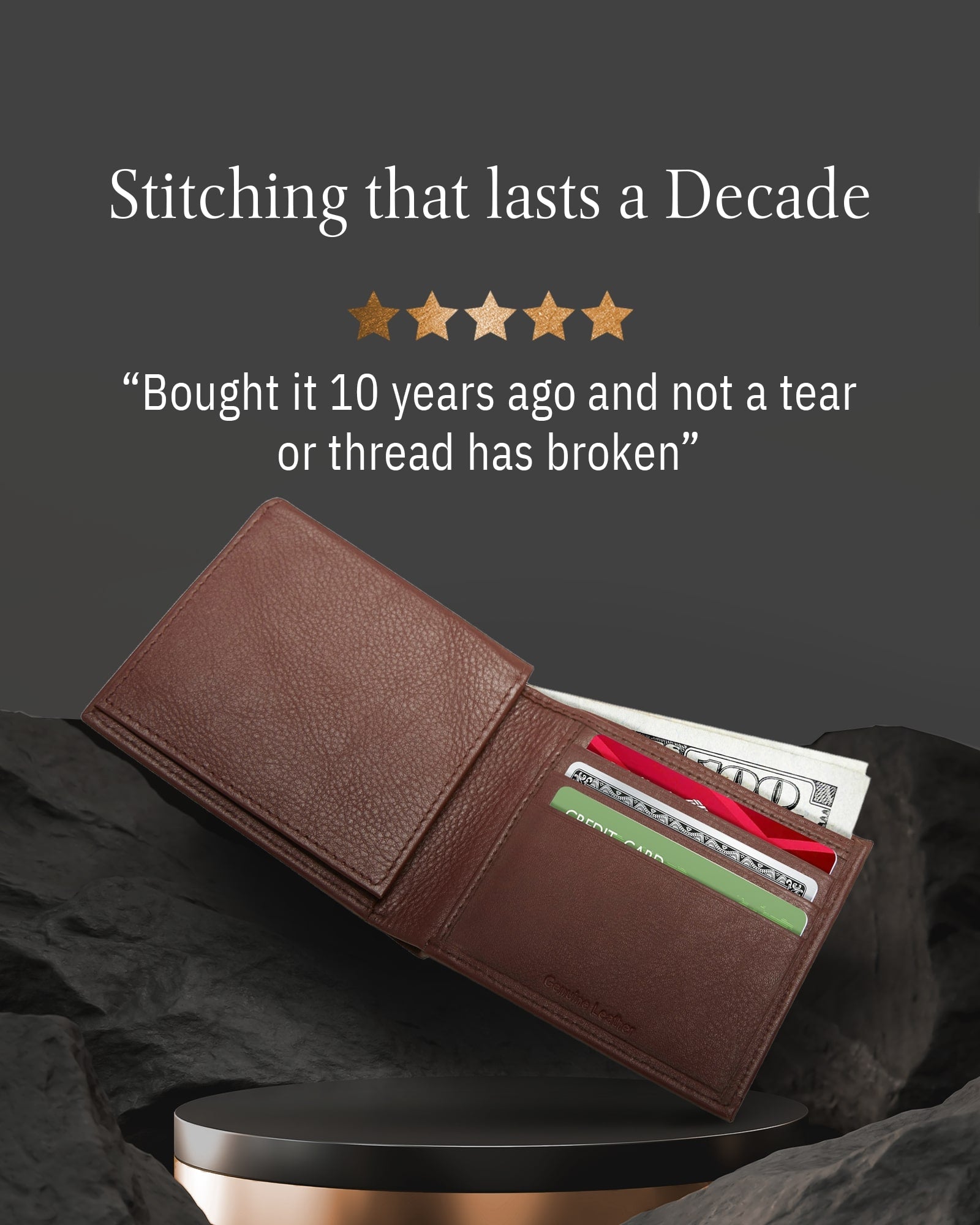 - This Bifold Wallet is made out of Genuine Full Grain Leather that is extremely soft and durable. Its smooth texture makes for a neat and stylish Wallet, perfect to use every day.