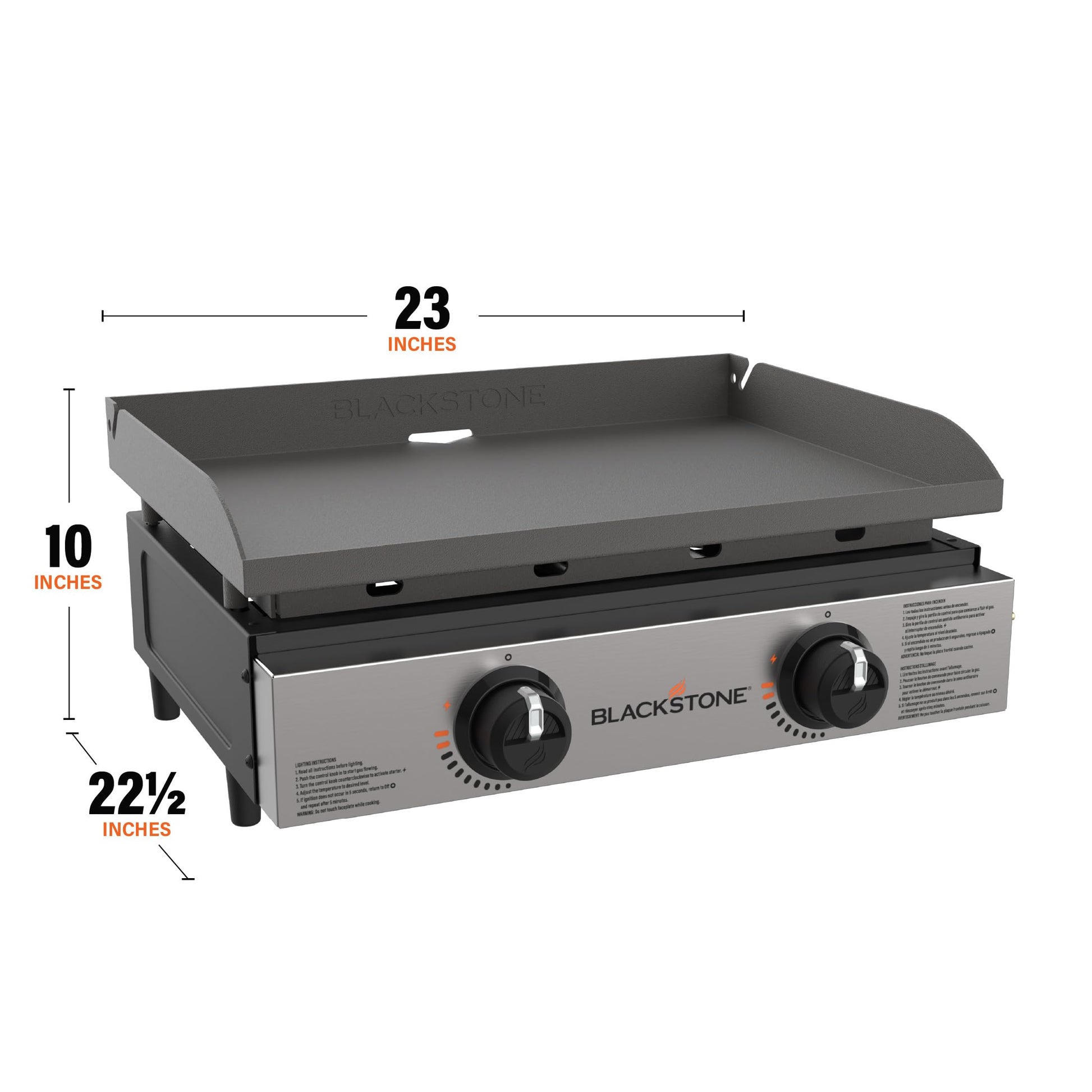 Details: Stop manhandling those heavy, bulky backyard grills and become the ultimate grill master with Blackstone 22" portable griddle. It's small, compact and designed to get you cooking anywhere. Featuring two powerful "H" style burners, this steel griddle can be taken camping, tailgating or even cookouts. All you need is a small propane bottle to get fired up and you can start griddling right away! The best part is that you can literally cook just about anything. Eggs and bacon for breakfast, burgers, sliders, hot dogs, quesadillas or fajitas for lunch and maybe some seafood or steak for dinner. Features: • Tiny yet powerful: Despite being small in size, this camping griddle can produce 24000 BTUs of heat. This means it will heat up quickly and get the cooking thoroughly within just minutes. • Rust-resistant: The griddle surface is made of rolled carbon steel which is durable and corrosion-resistant. • Portable: Easy to take around with you anywhere, be it in the backyard or woods. • Adjustable-height rubber feet: You won't have to worry about cooking on uneven surfaces as our countertop griddle comes with legs for stability on any surface, from grassy hills to muddy terrain. • Grease catcher spray for healthier cooking and easier cleanup. • Two (2) Adjustable Heat Controls with Built-in igniters: Makes it easy to turn on the heat and allows you to cook different foods at different temperatures. The 339 sq. inch heavy-duty cooking surface fits up to: • 12 Burgers • 30 Hot dogs • 16 Eggs Specifications: • Cooking surface: 22'' / 339 sq. inch plate • Heat: 24,000 BTUs • Fuel Type: Propane • Fuel: Uses a 1 lb. Propane Bottle (Not Included) or a 20 lb. Propane Tank with the Propane Adapter Hose with Regulator (Not Included) • Assembled Dimensions: 22.5" L x 9" H x 19" W; 32 LBS Package includes: Blackstone Griddle.