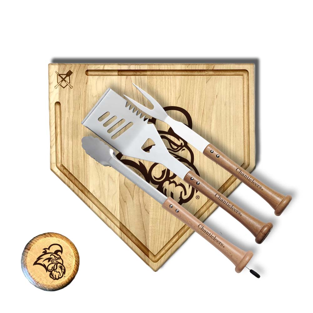 - Includes: "Slider" Spatula, "Forkball" Fork, "Splitfinger" Tongs, and "Home Plate" Cutting Board.