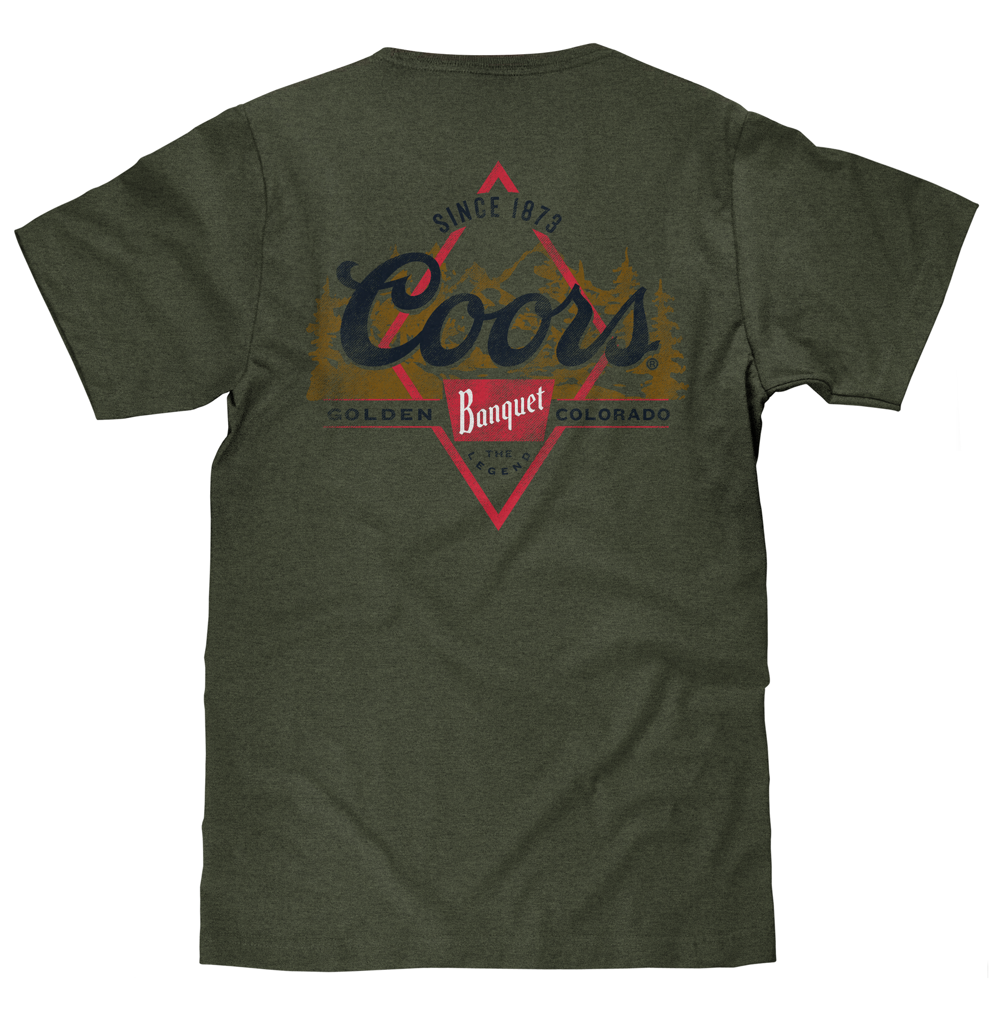 We wanted to bring some of that heritage to you, so our team crafted a comfy double-sided nature inspired t-shirt that's fit for any loyal fan. This beer shirt features the Coors Banquet logo on the front left chest. For the back, we've selected a larger version of the Coors Banquet logo on a subtle forest background, along with "Since 1873", "Golden Colorado" and "The Legend" text.