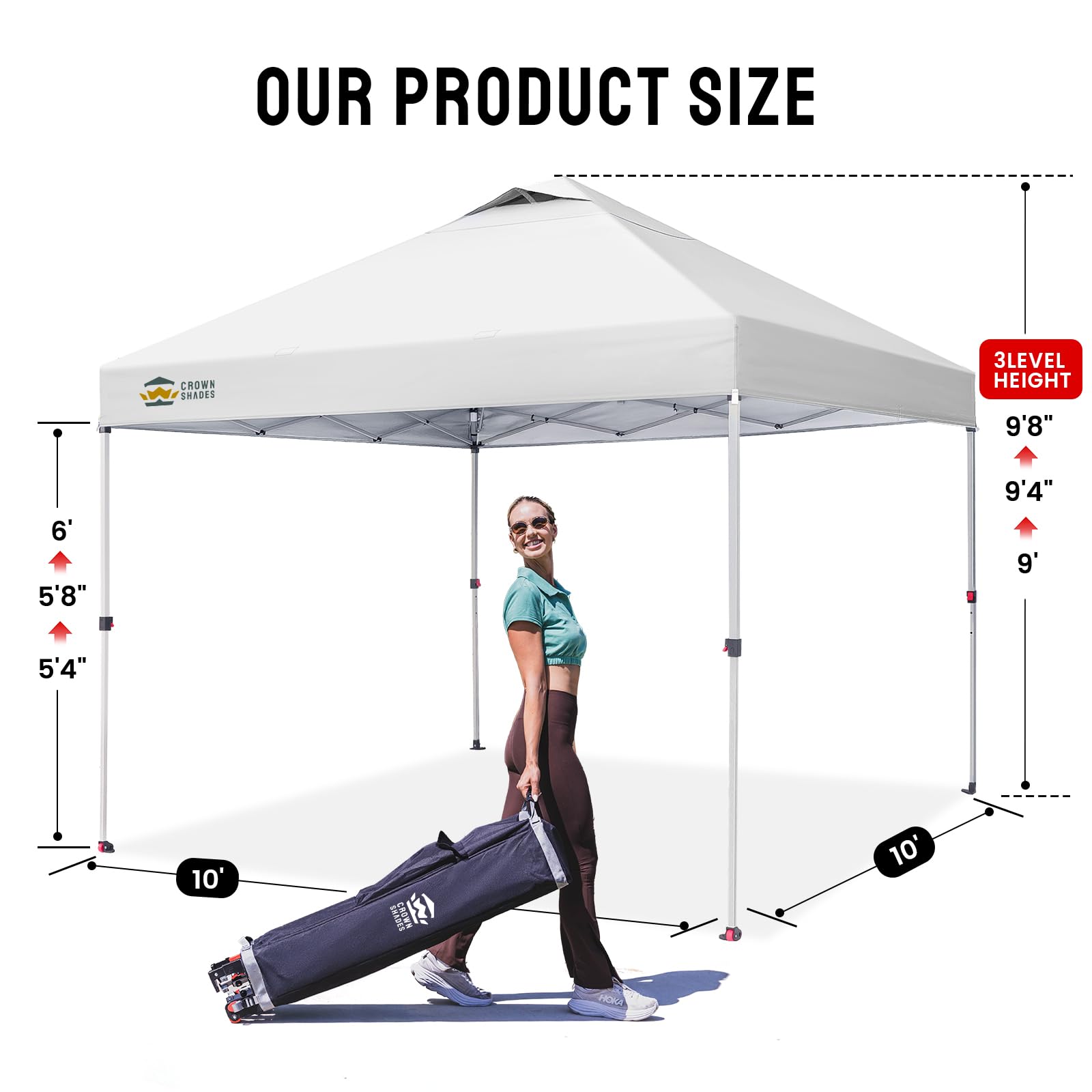 - SPACIOUS AND COMPACT - With a 10' x 10' canopy footprint, this tent provides 100 square feet of shade, accommodating up to 10 people comfortably. The interior height exceeds 9 feet, and the maximum clearance under the valance is over 6 feet. When packed, the dimensions are 45โ x 8.5โ x 8.5โ, fitting perfectly in your vehicleโs trunk. The headroom is enhanced by the absence of overhead crossbars, offering more spaciousness compared to traditional designs, making it great for parties and events