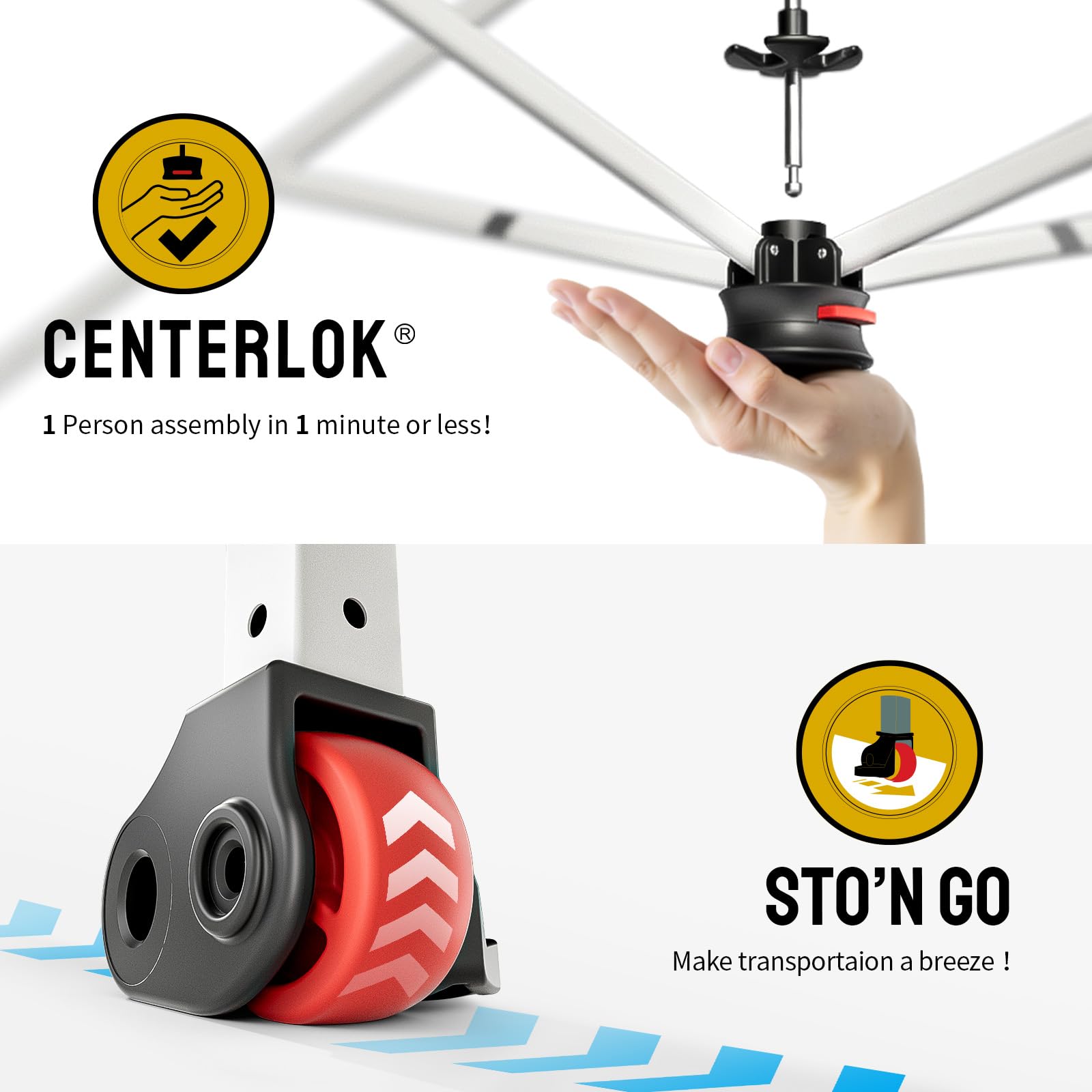- STOโ N GO SYSTEM - Our lift-free system makes collapsing, storing, and transporting the 10x10 tent a breeze. The 10x10 popup canopy can be stored with the fabric attached, with a specialized pocket for 4 sandbags, 8 stakes, and 4 guy ropes. Integrated wheels in the feet allow easy movement even when the instant shelter tent is set up, by simply lifting the side without wheels. This feature is especially useful for quick setup and takedown at locations like the patio or sports events