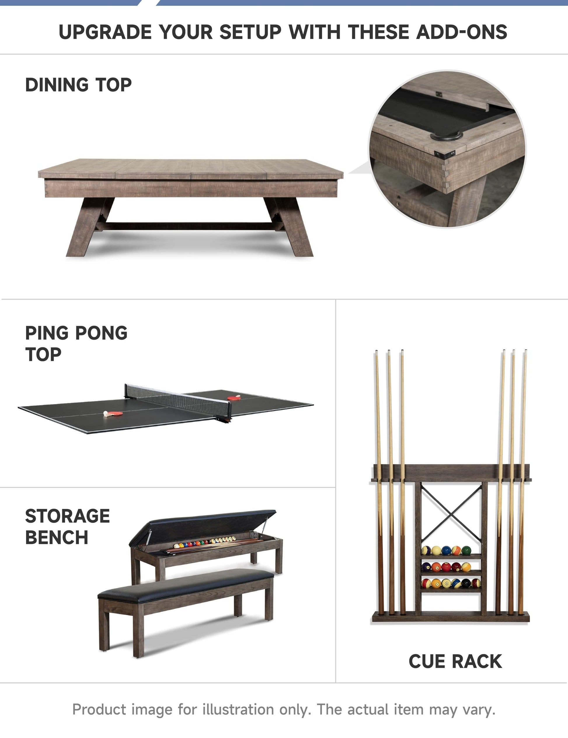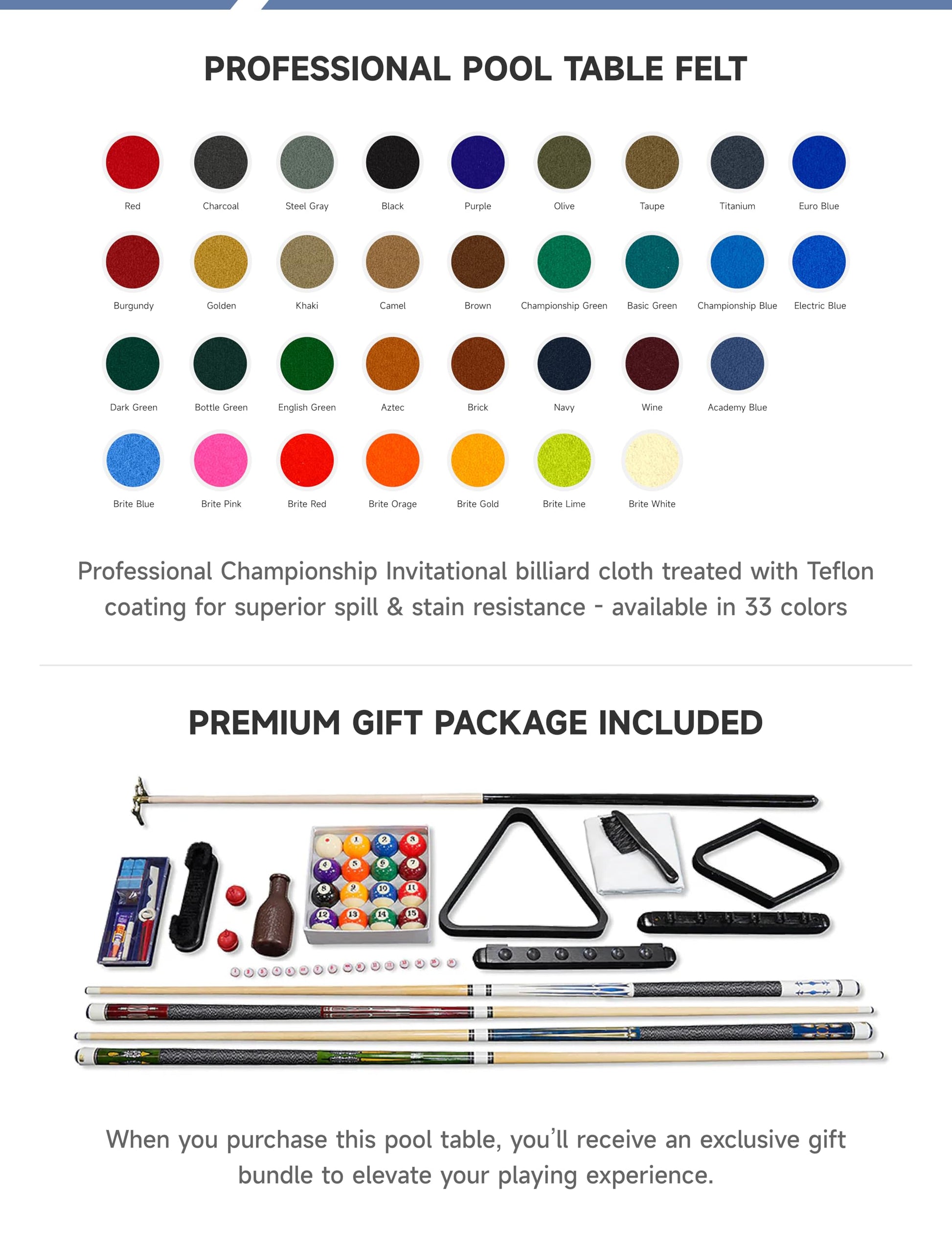 - Play Kit:When you purchase this pool table, you'll receivean exclusive gift bundle to elevate your playingexperience.