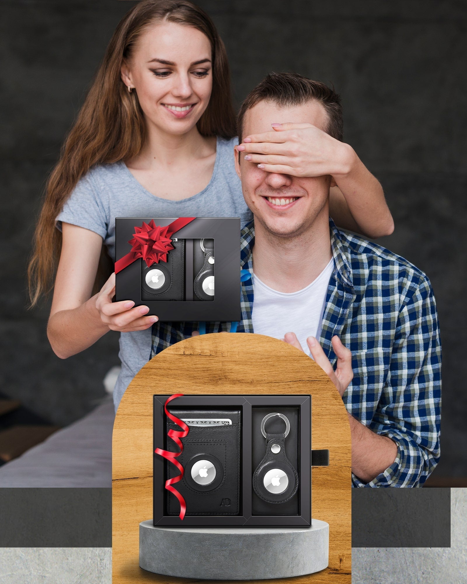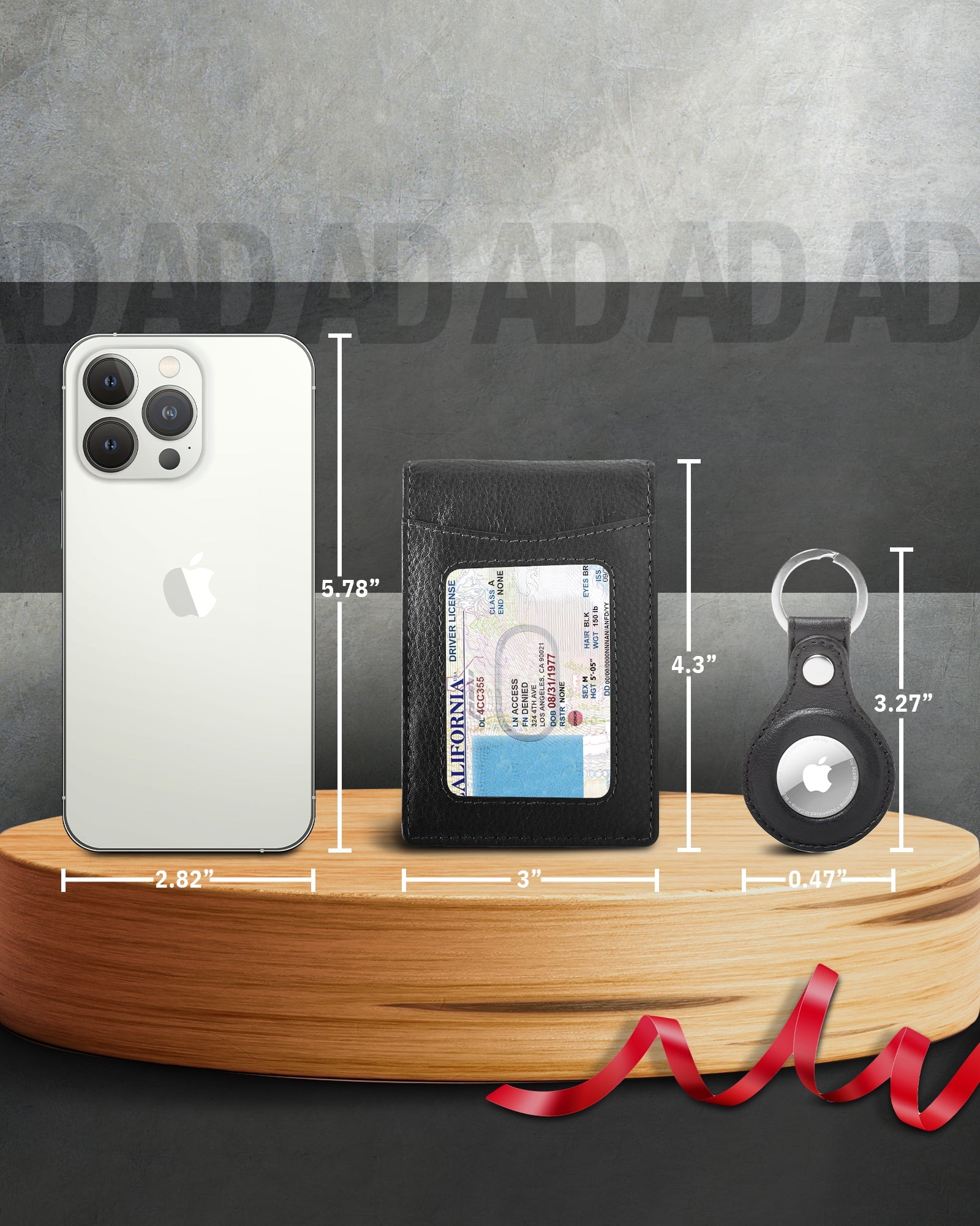 Genuine Leather Money Clip Wallet and Airtag Keychain Gift Set