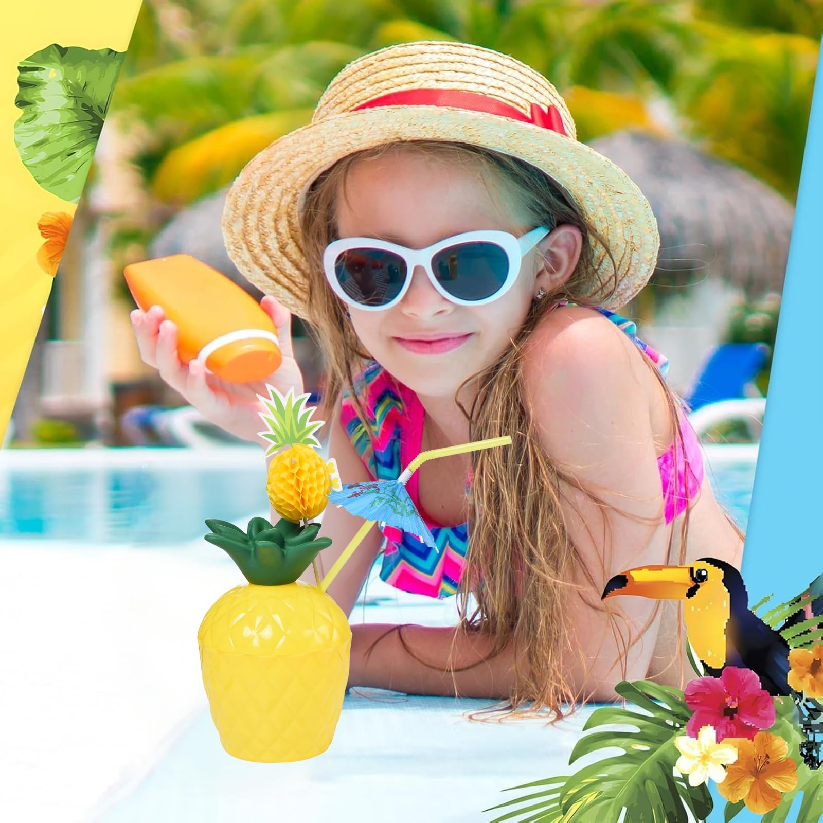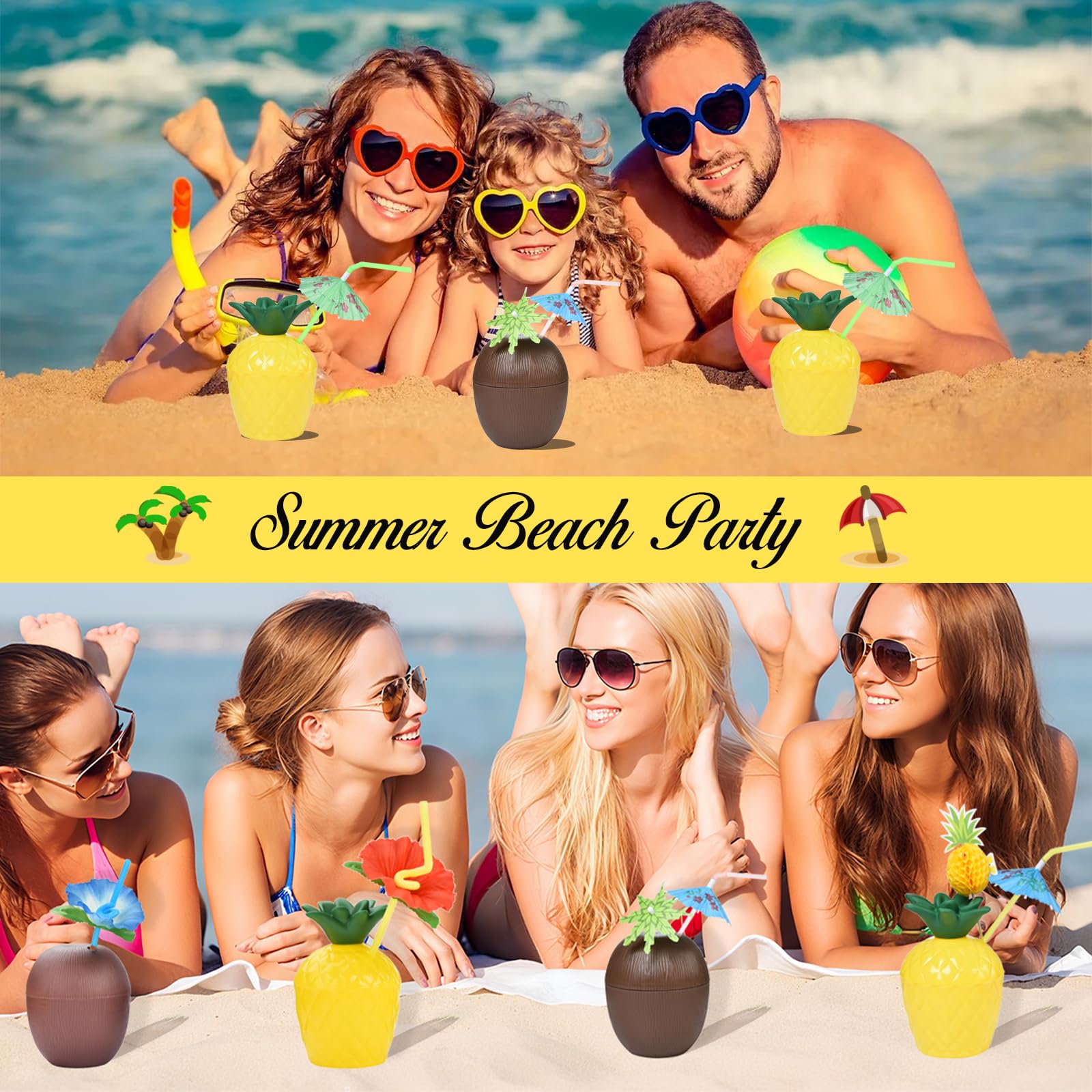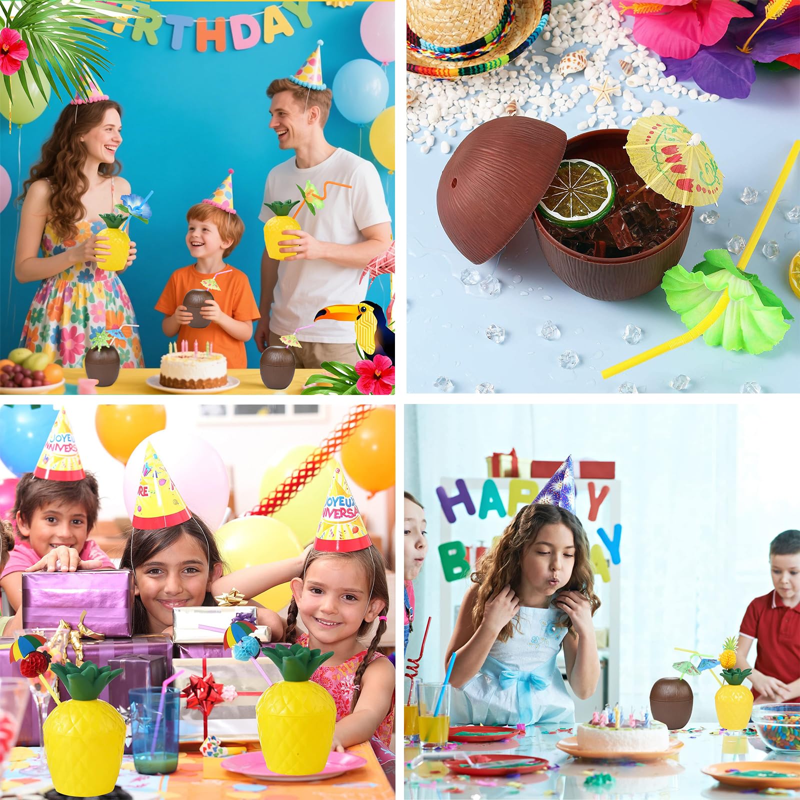 - Package----Include 9 pcs coconut-shaped cups and 9 pcs pineapple-shaped cups with lids, 18 pcs assorted color bendable umbrella straws, 9 pcs coconut tree umbrella and 9 pcs pineapple cocktail picks.