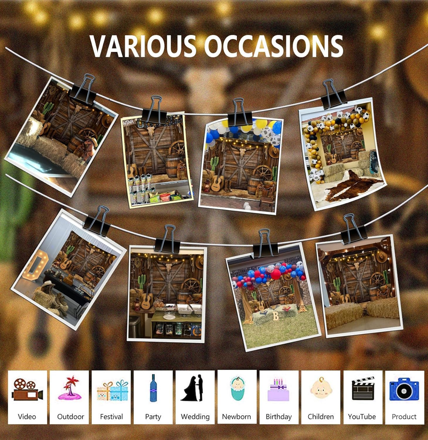 - Create Authentic Wild West atmosphere : The design features iconic western elements like cowboy boots, horse saddle, bull head and a rustic wooden barn. It's like stepping into a classic western movie. This backdrop will instantly transport your guests to the rugged charm of the Old West.