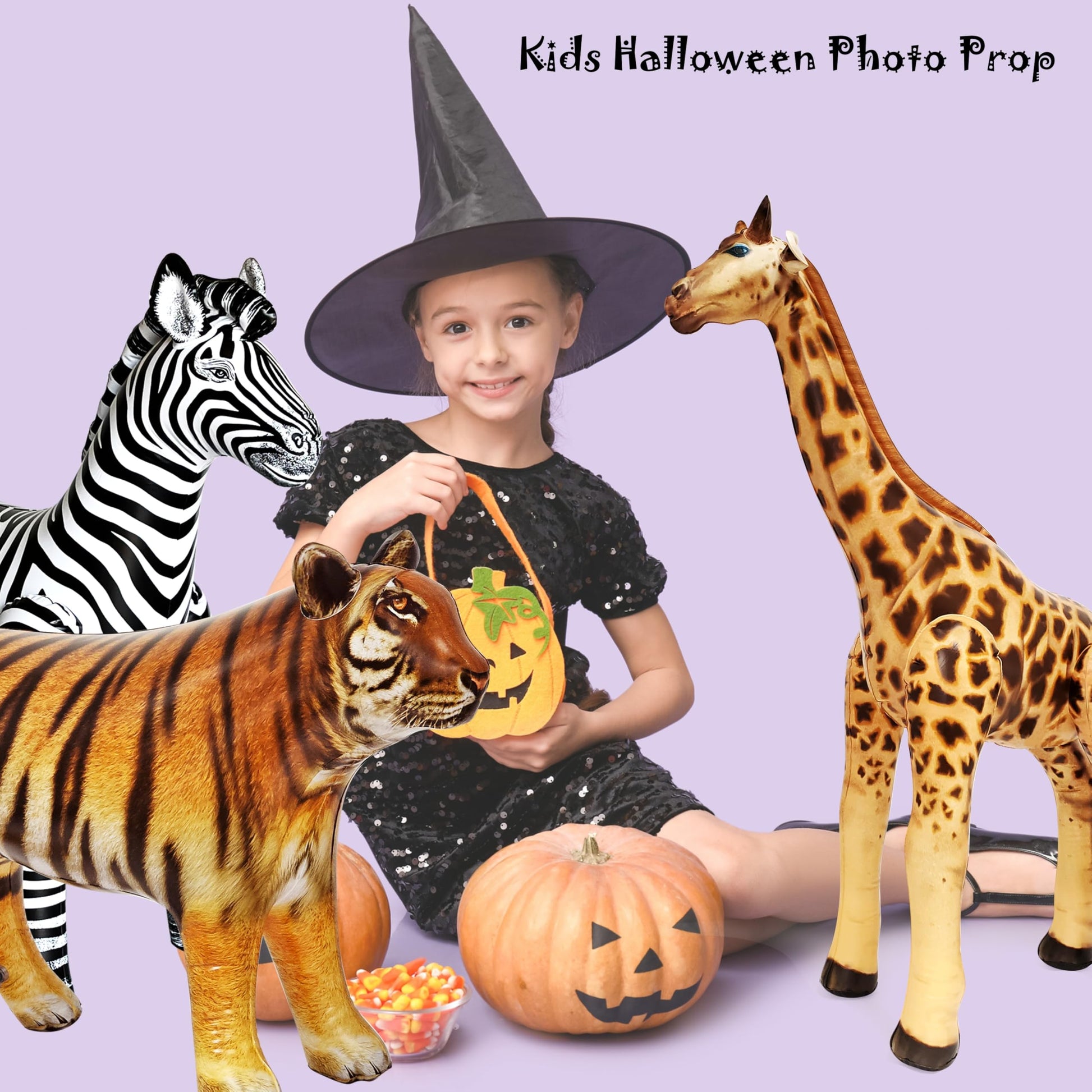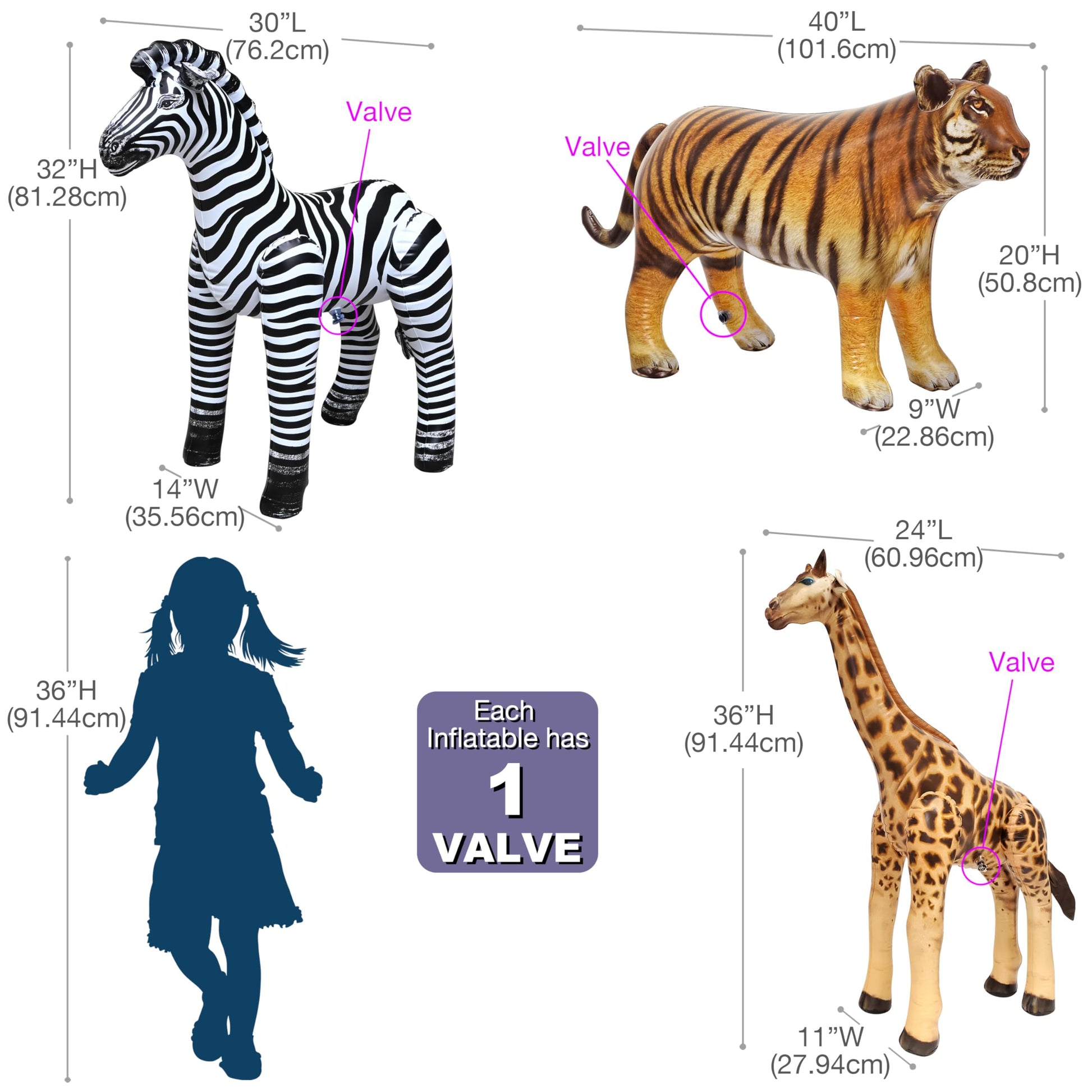 - 3 STAND-ALONE SAFARI ANIMAL FIGURES: Giraffe 36" tall/24" long; Zebra 32" tall/30" long; Tiger 20" tall/40" long; Balanced design and sturdy feet that stands upright on flat surfaces