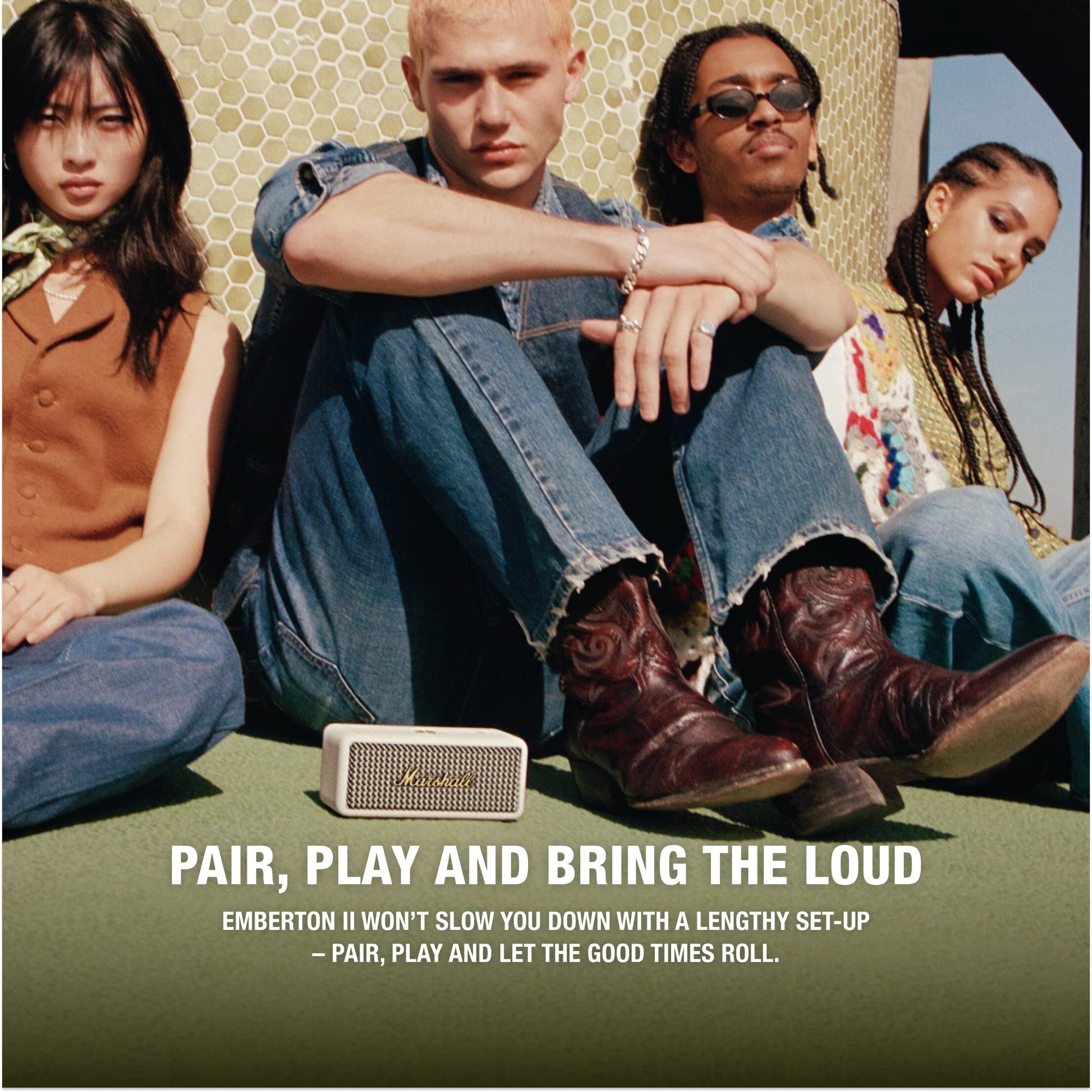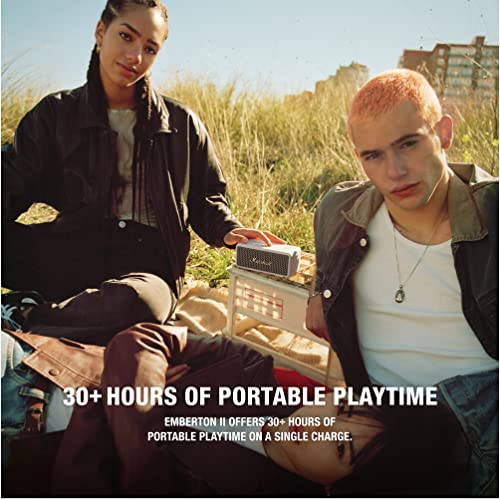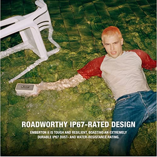 Details: Emberton II is a compact portable speaker with the loud and vibrant sound only Marshall can deliver. Two 2’’ full range drivers and two passive radiators bring you the heavy Marshall sound you know and love. Experience absolute 360° sound with True Stereophonic, a unique form of multi-directional sound from Marshall – where every spot is a sweet spot. By separating out the spatial content of stereo recordings, Emberton II produces a sound much larger than its size and outperforms most speakers in its class. Amplify your sound with a multi-speaker Stack Mode session by connecting your speaker to other Emberton II speakers. With 30+ hours of playtime, you can enjoy the superior sound of Marshall for hours on end.This lightweight speaker is tough and resilient, weighing in at only 0.7 kg(1.5 lbs) while boasting an extremely durable and easy-to-use design, making it a must for any occasion. Emberton II has an IP67 dust- and water-resistance rating so it won’t let rain or dirt get in the way of your music. The textured silicone sleeve arcs back to the classic vinyl that encased the original amplifiers and signature details, such as the solid metal grille and iconic Marshall script, echo the legacy of rock ’n’ roll that you know and love.