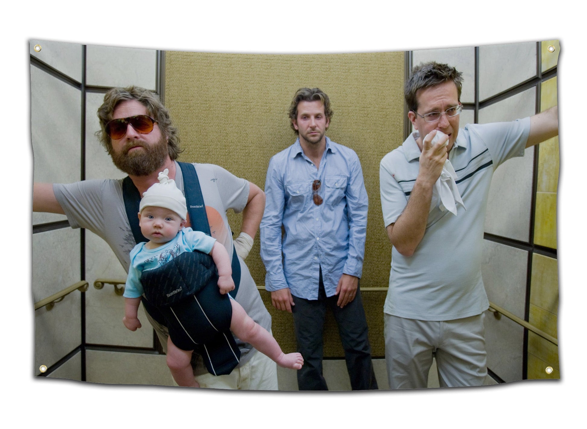 This legendary elevator shot from The Hangover features the wolf pack in full post-bender chaos: a baby in a carrier, a missing tooth, and no memory of what happened.