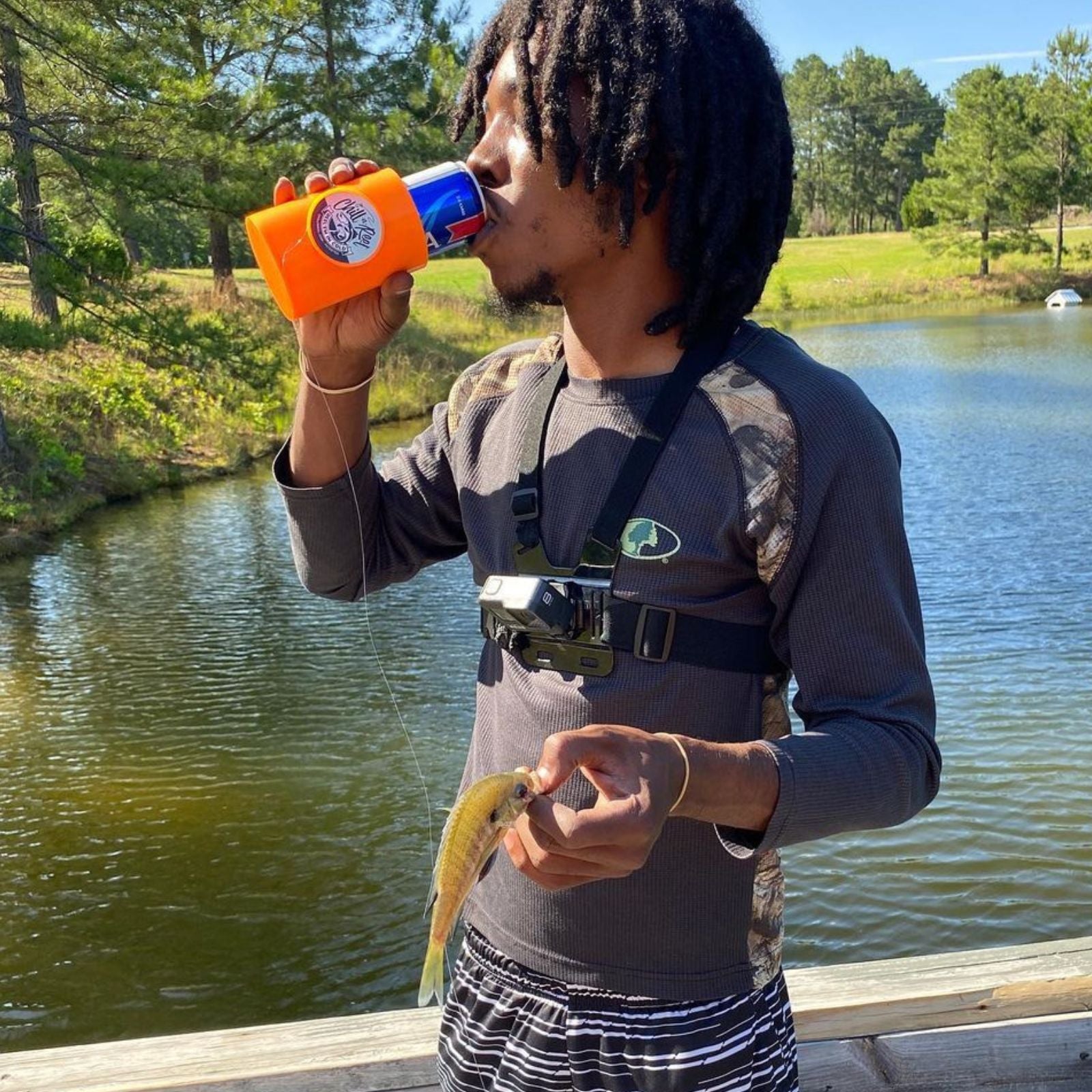 Our unique all-in-one drink insulator with hand-line fishing reel attached keeps you hydrated and having fun for hours! Invented by a firefighter while on vacation: he was standing in waist-high water with a beer in hand and wanted to find a way to keep holding his drink and catch the fish swimming around him!