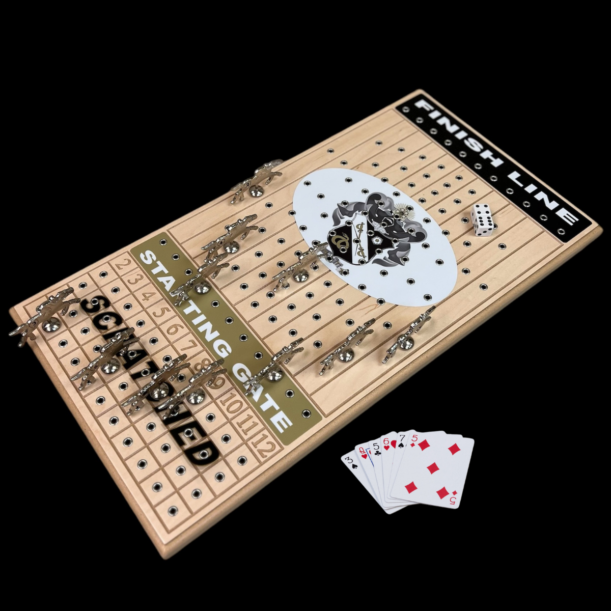 Line up the horses at the starting gate, deal the cards and begin rolling the dice to scratch horses and start building your “pot”. The remaining horses race to the finish line. Hold the winning horse’s card and you win! These are the highest quality handcrafted horseracing board games available.