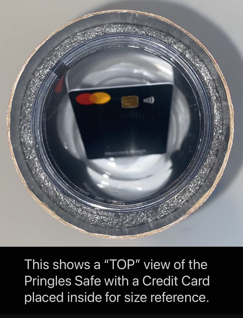 Details: Our potato chip can safe has two hidden compartment's the first one sounds real like chips rattling when the can is shaken and the second one is 6 inches deep by 2 1/4 inches which is wide enough to hold credit gift cards the bottom twist's off to reveal the large hidden compartment this safe is fool proof and blends into all the items around it in the cupboard or pantry a lot of work has been put into each and every can making it a perfect and secure place to hide your money jewelry and valuables also comes with a large smell proof bag for sensitive materials