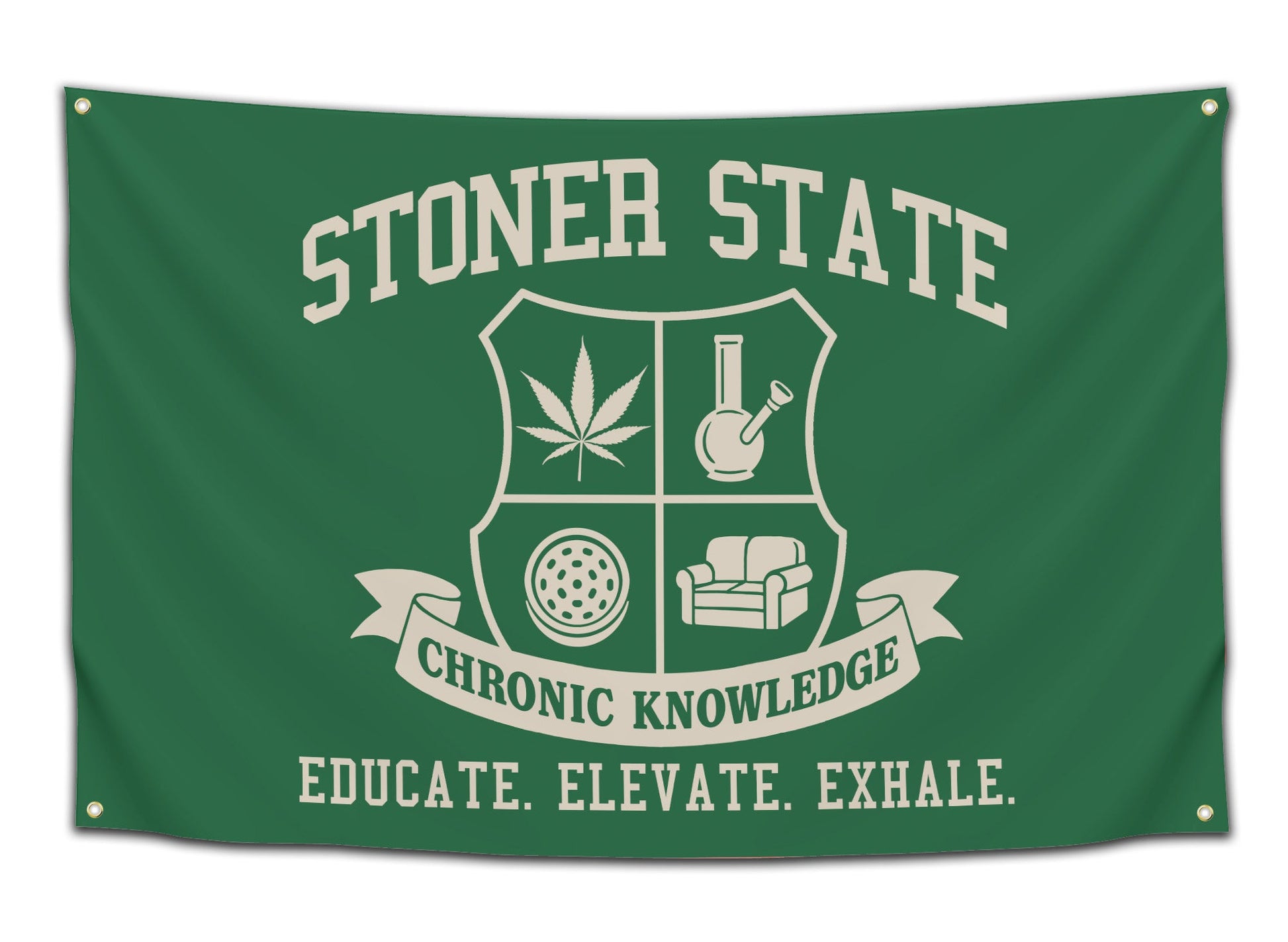 This green flag features a fake college crest with a weed leaf, bong, grinder, and recliner under the motto “Chronic Knowledge” — made for scholars of the sesh and philosophy majors in kush.