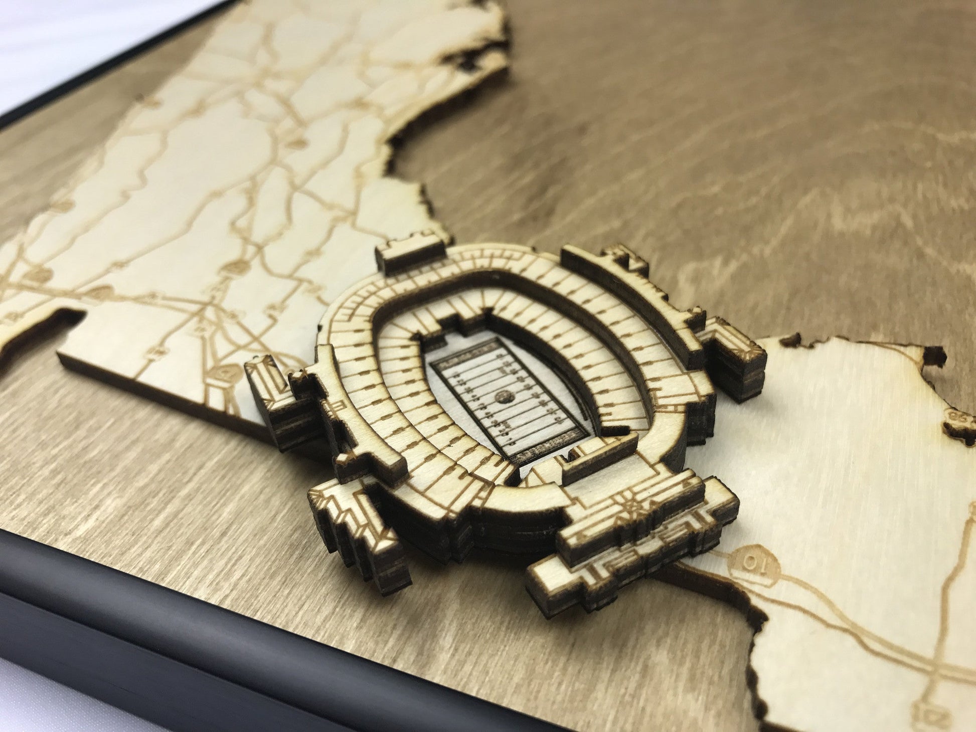 Make a bold statement with StadiumMapArt! Check out this state-shaped, laser cut wood art featuring your favorite teams' stadium and its locale. Major highways and interstates are engraved and labeled. Highlighting this aerial image is the uniquely designed and handcrafted 3D stadium. Displaying this signed piece on your wall is a sure-fire way to spark a sports conversation or ignite a fond memory. Show your spirit and score a win with StadiumMapArt!