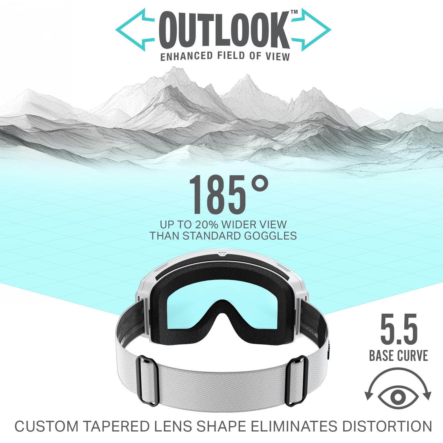 - Wider Vision Than Most Cylindrical Goggles: Outlook is our new enhanced field of view design. The ultra-wide FOV of the 185-degree lens wraps around your face and provides you with maximum visibility. Combined with the engineered tapered lens, you get a wide, distortion-free experience on the mountain.